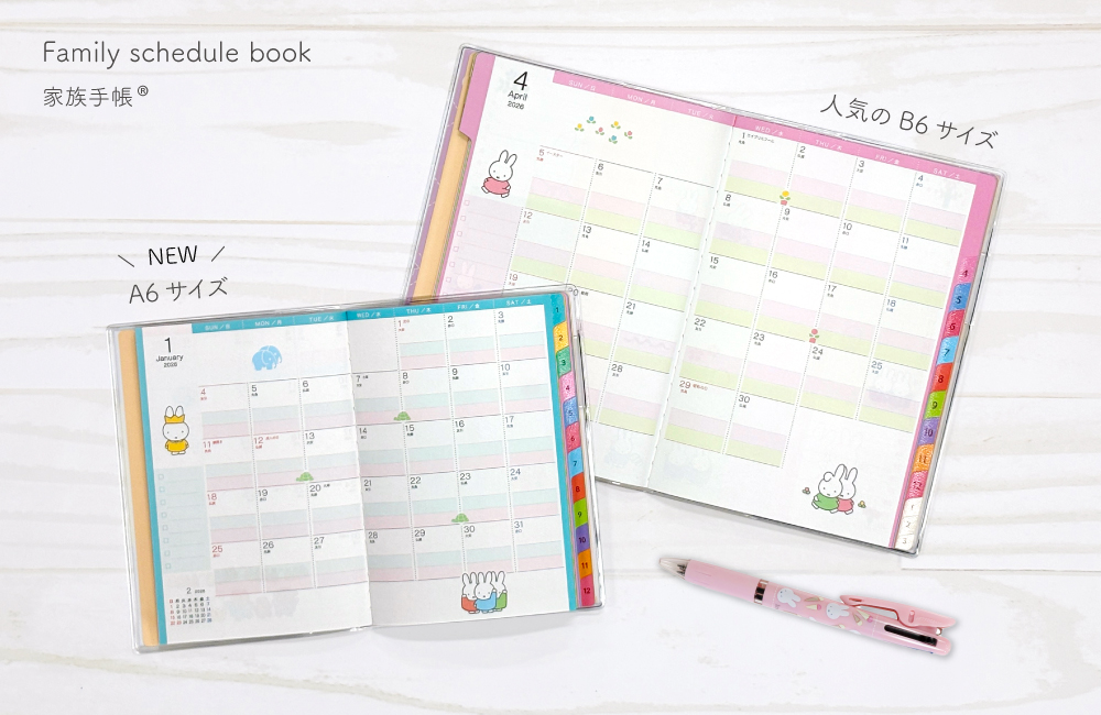 イラストがいっぱいのかわいいデザインと、家族の予定を分けて書ける色分けラインが大人気です。ロングセラーで、長くご愛用いただいています。