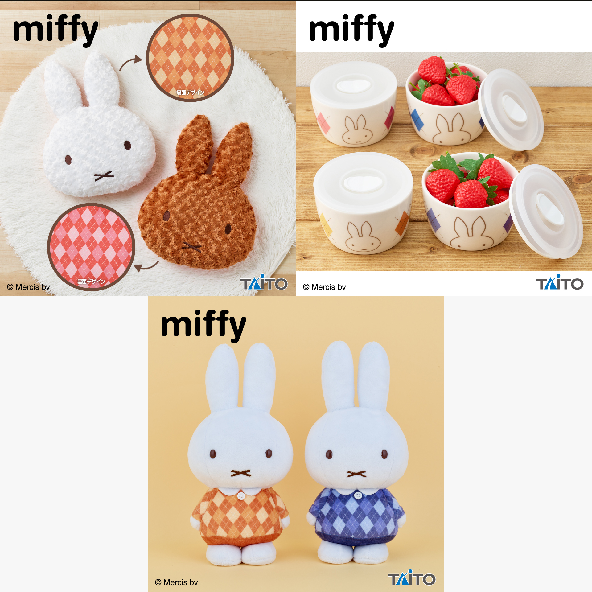 ミッフィー ローズボアクッション アーガイルver.、ミッフィー フードストッカーセット アーガイルver.、ミッフィー ぬいぐるみ アーガイルver.