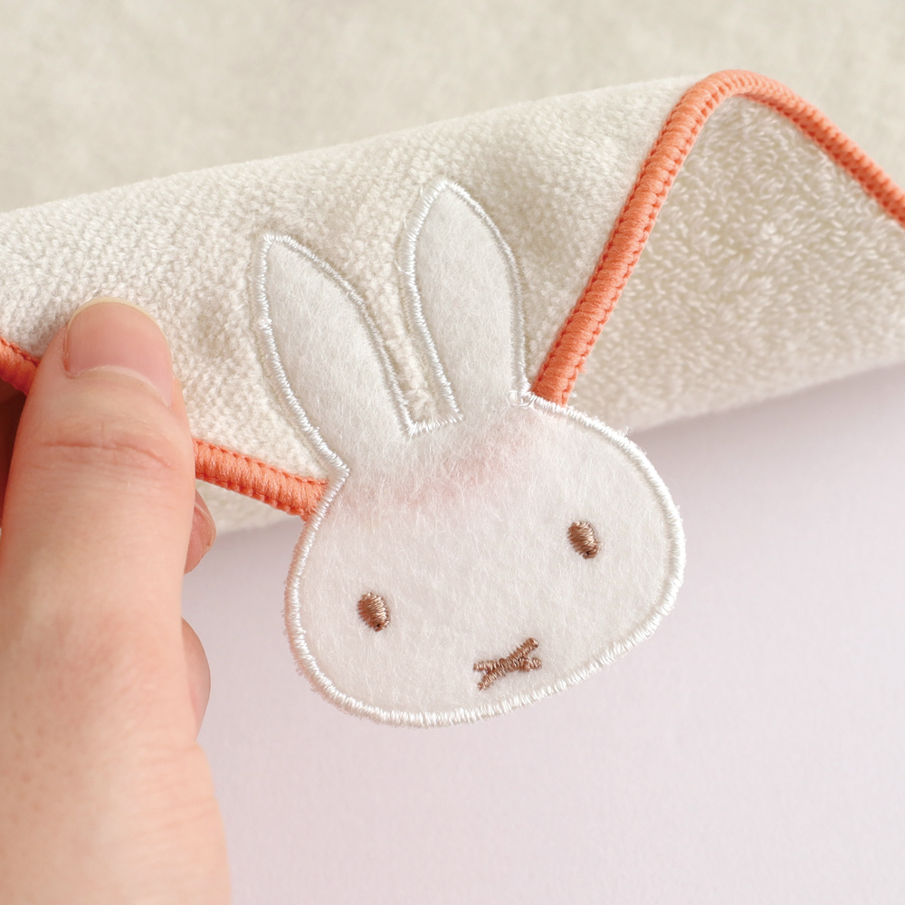 ミッフィーのお顔型のワッペンを縫いつけました。折り畳んだ時にちょっと飛び出す様子が持ち歩いていて楽しいハンカチです。ハンカチ本体の手触りにもこだわりました。