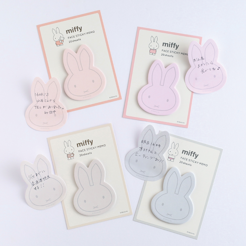 とんがり耳のミッフィーのお顔型に抜かれたふせん。下部分にのりがついているので、耳を書類や本からはみ出してブックマーカーのようにも使用できます。