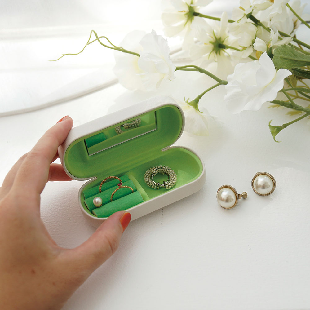 仕切り付きでアクセサリーなどの小物を収納するのにぴったり。スリムな形状で、外出時や旅行の持ち運びにも便利です。内側は起毛素材になっており大切なアクセサリーなどを優しく保管することができます。