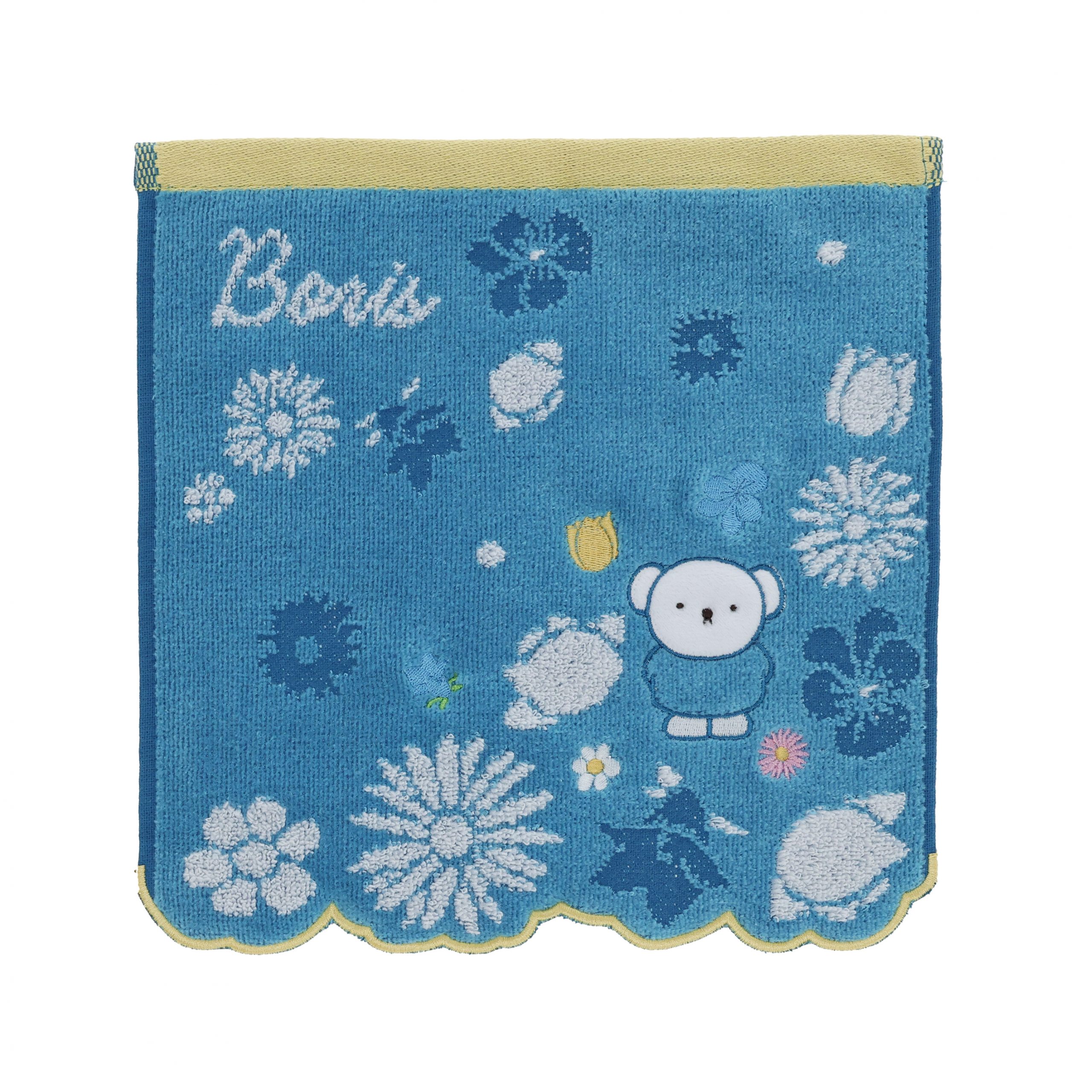 毛中にはタオルの織りで表現したお花と、ミッフィー、ボリスのまわりにも刺繍でカラフルなお花をあしらっています。
