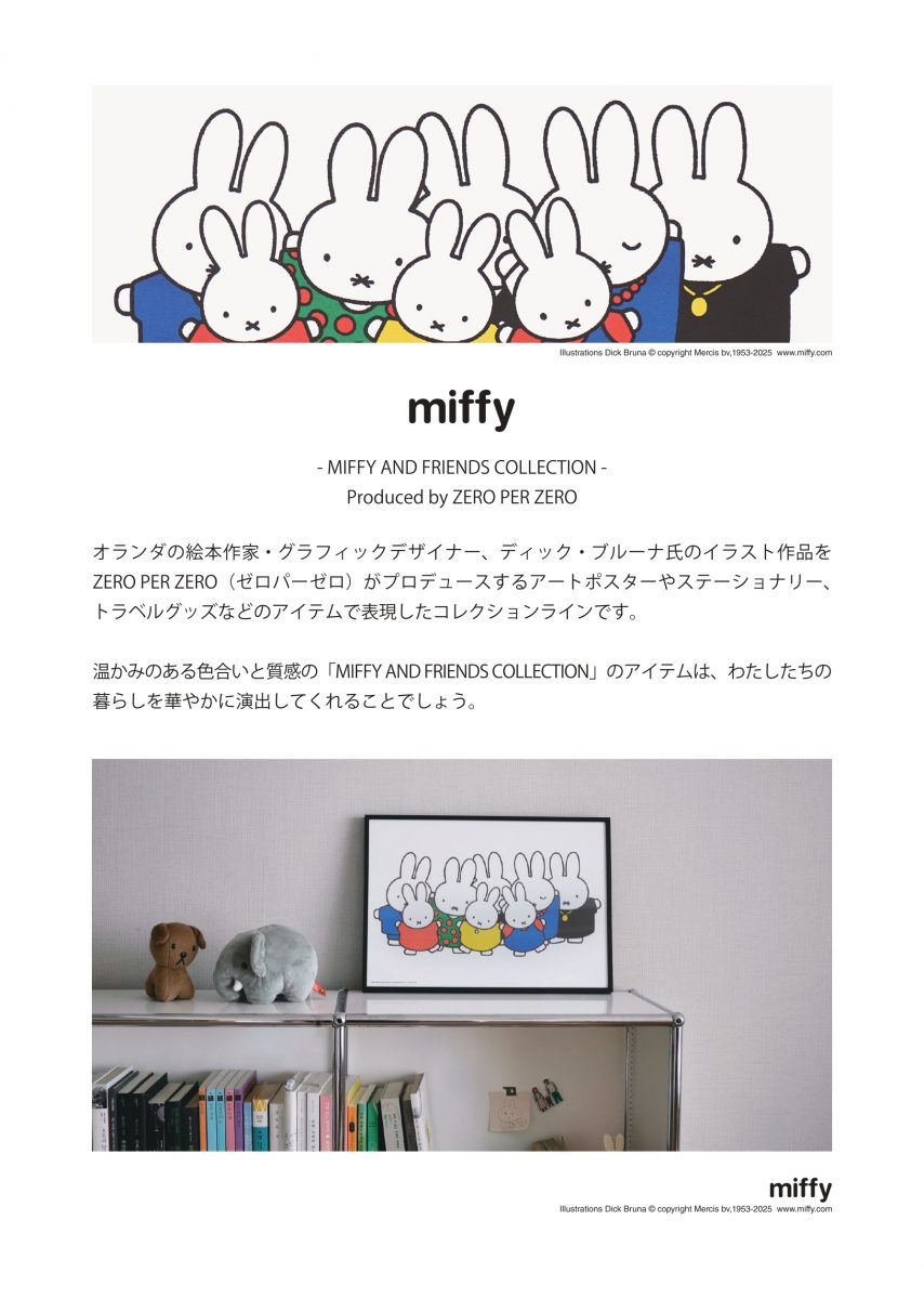 「MIFFY AND FRIENDS COLLECTION Produced by ZERO PER ZERO」は、ディック・ブルーナの作品をZERO PER ZERO がプロデュースするアートポスターやステーショナリー、トラベルグッズなどのアイテムで表現したコレクションラインです。