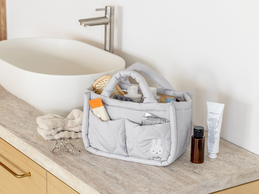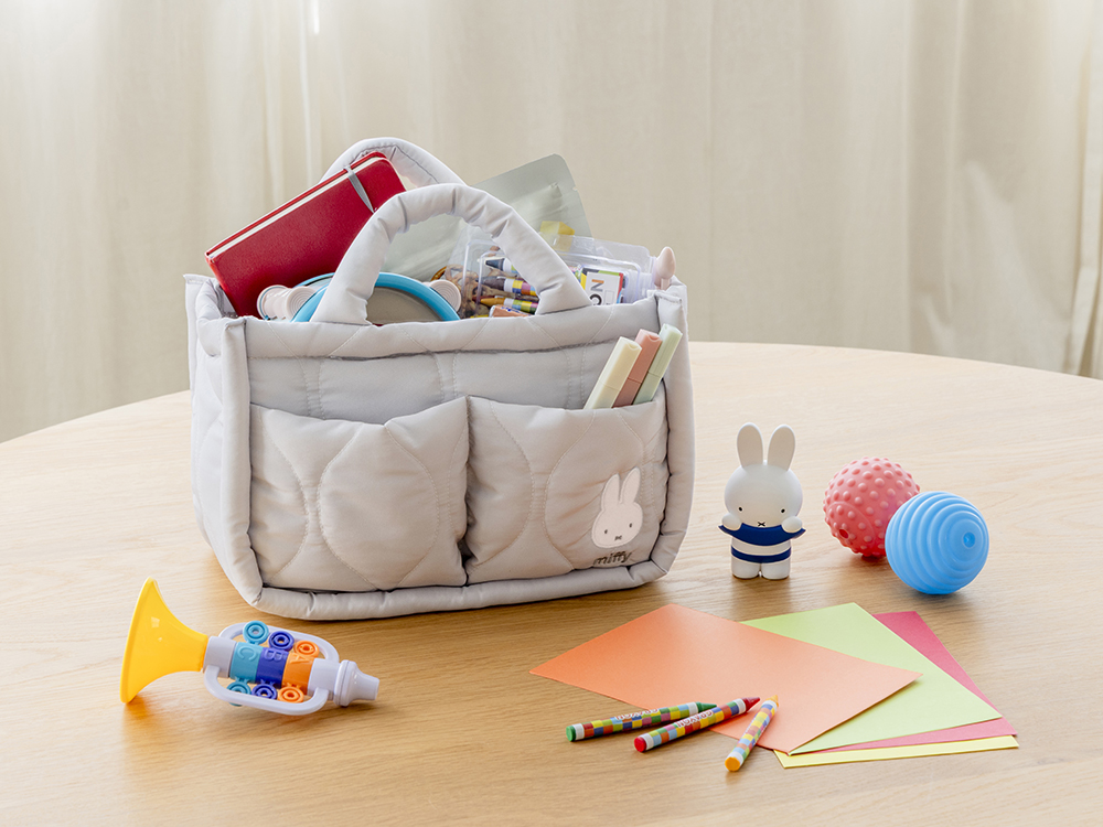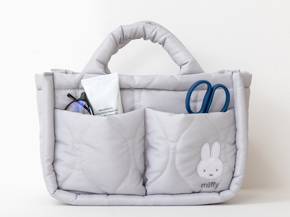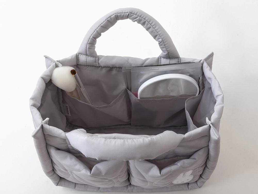 5つのポケットとループがついた整理上手な収納トートバッグは、おうちに馴染みやすい明るいグレー地と、ふわふわのミッフィーがポイントです。