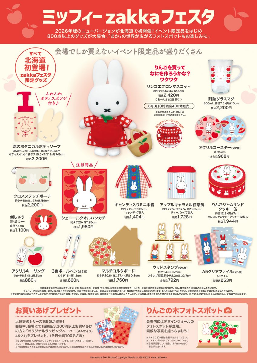 2026年6月3日(水)から6月15日(月)まで、大丸札幌店にてミッフィーの雑貨のお祭り「ミッフィーzakkaフェスタ」が開催されます。